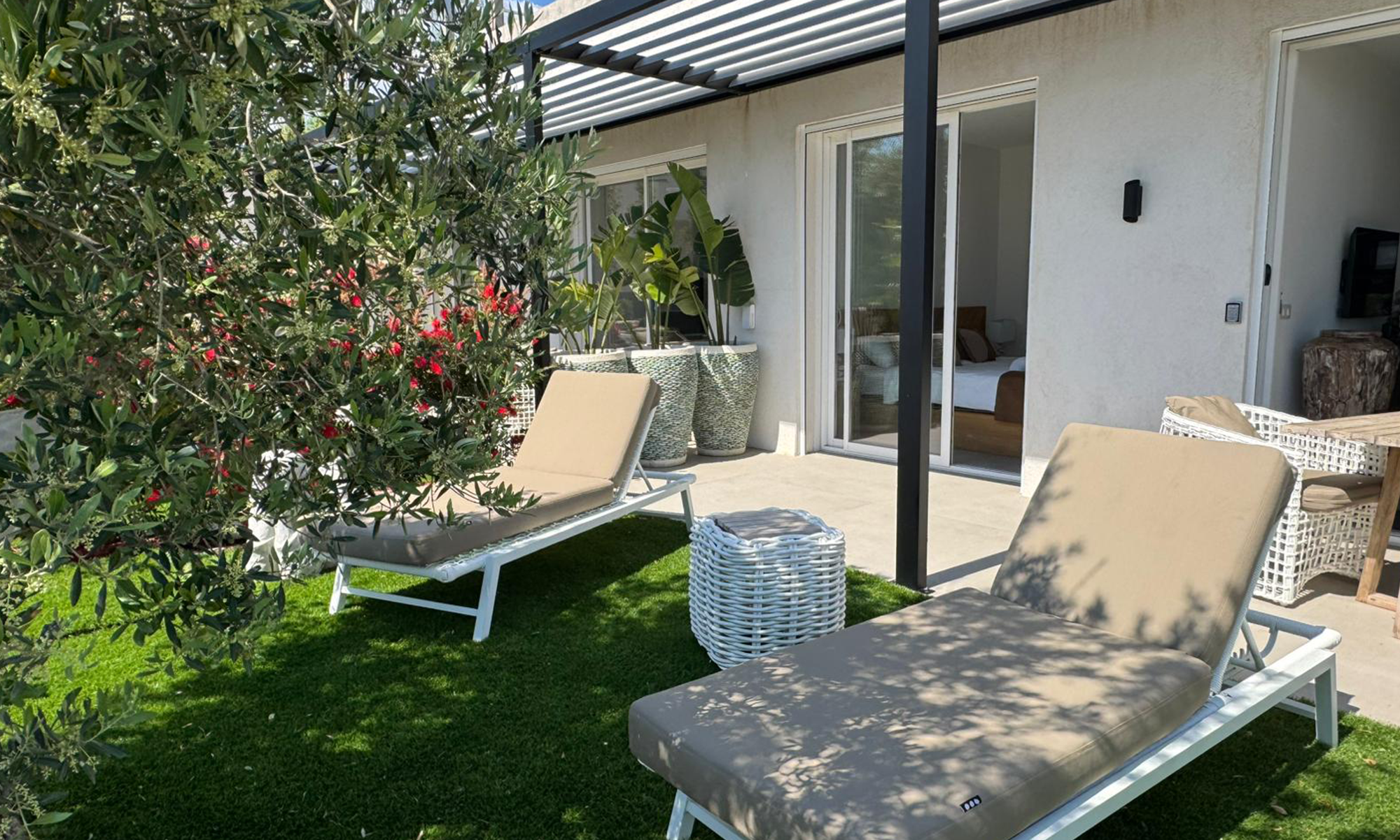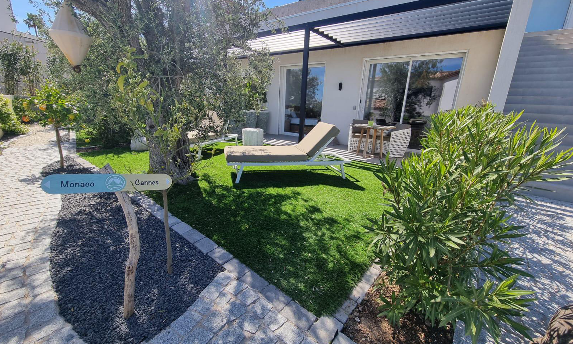 Cet appartement en rez-de-jardin vous offre un petit coin de verdure privé où vous pourrez vous détendre au milieu des plantes méditerranéennes. La terrasse, entourée de haies et de fleurs, crée un cadre intime et paisible, parfait pour savourer un café matinal ou un apéritif en soirée. L’intérieur de l’appartement est conçu pour votre confort, avec une décoration simple mais élégante et des équipements modernes.