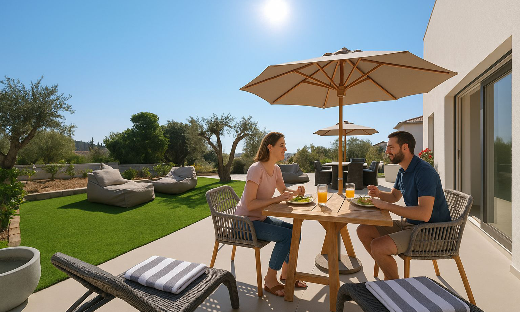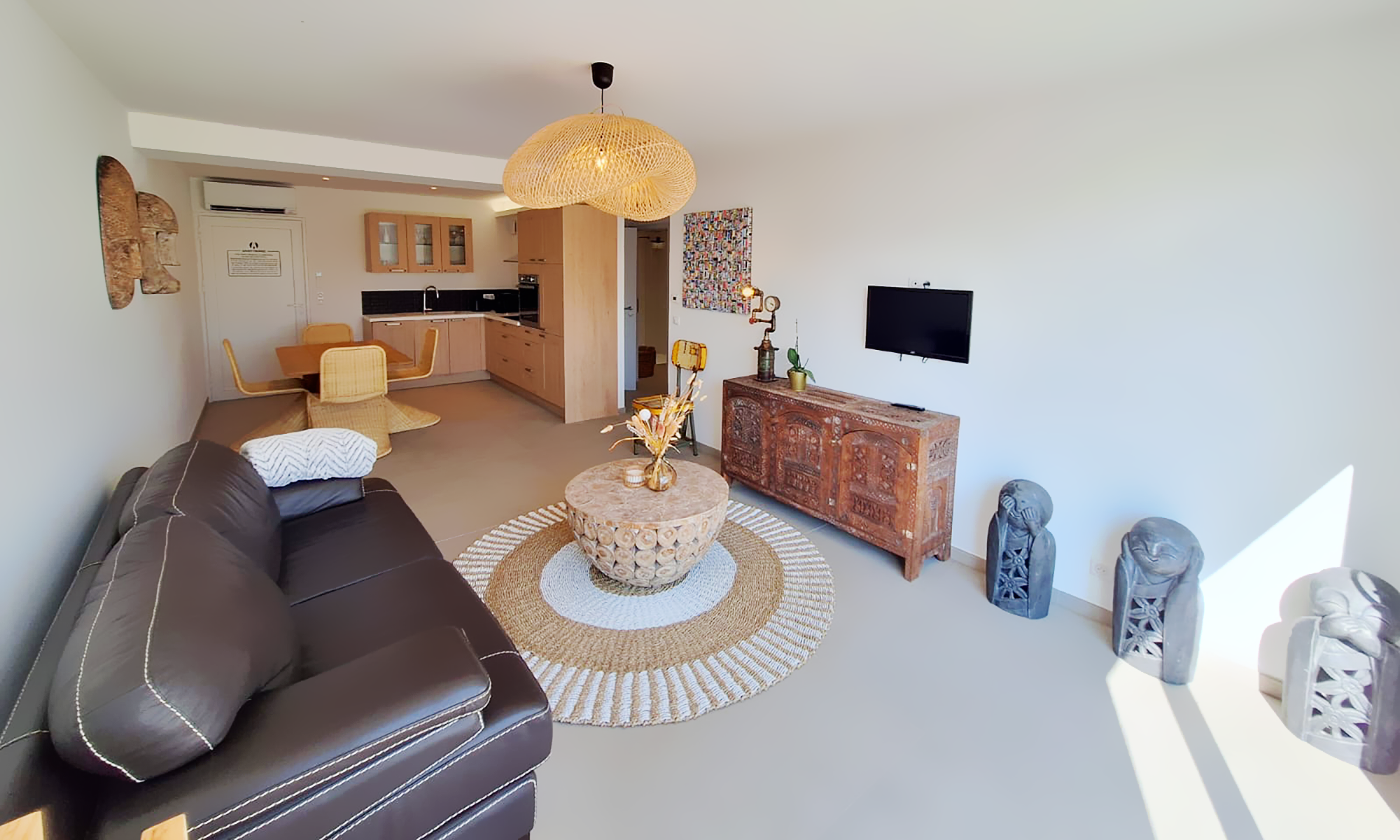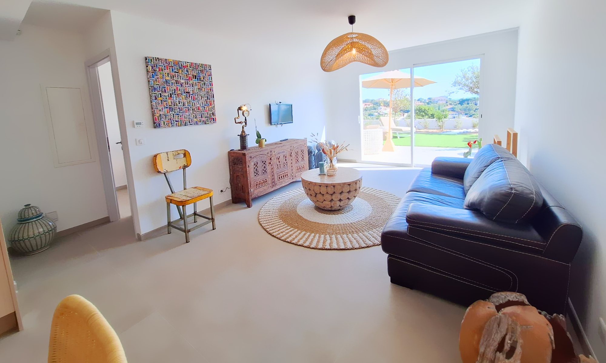 Cet appartement de plain-pied vous accueille dans une ambiance élégante et épurée, avec des tons clairs, un mobilier contemporain et une belle luminosité naturelle. Depuis la terrasse privative, vous profitez d’une vue dégagée sur la Méditerranée, parfaite pour vos petits-déjeuners au soleil ou vos soirées à la belle étoile.